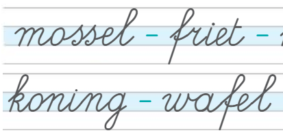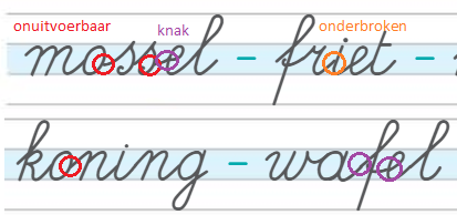 In deze voorbeeldwoorden uit een werkschrift voor leerjaar 2 (groep 4) vallen meteen de verbindingen vanaf de letter ‘o’ op. Deze zijn onlogisch en kunnen alleen maar uitgevoerd worden door de pen op te tillen. Als je langer kijkt zie je dat er ook verbindingen zijn met een ‘knak’ en verbindingen waarbij de lijn onderbroken is. Kortom, ook bij materialen die speciaal voor het schrijfonderwijs gemaakt zijn - en zelfs bij commerciële schrijfmethodes - zul je kritisch moeten kijken of het font wel voldoet.