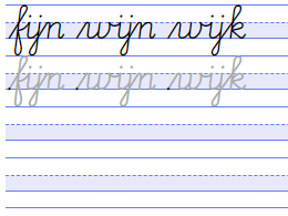 Het linkervoorbeeld is een fragment van een letterkaart van “Schrift”De methode Schrift is niet meer verkrijgbaar. De opvolger heet Schriftcode.. Op deze letterkaart zijn de rechte lijnstukken blauw ingekleurd en de gebogen delen zijn wit gelaten. Bij het font “Schoolschrift” zie je deze rechte lijnstukken duidelijk terug. Ook in bijna elke verbinding tussen letters zit een recht stuk; alleen na letters die eindigen bij de romplijn (zoals de ‘b’) is dat niet het geval. Door de makers van het font “Cursive LOE” is gekozen voor veel minder - en ook minder duidelijke - rechte lijndelen. Met rechte verbindingen zijn de letters makkelijk te onderscheiden van de verbindingen en dus ook van elkaar. Bij gebogen verbindingen ontstaat de verleiding - voor leerlingen en soms zelfs voor fontontwerpers - om niet bij de romplijn aan te sluiten op de volgende letter, maar veel lager. Daardoor wordt het moeilijk om te zien waar een letter begint en ophoudt.