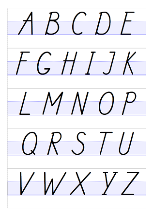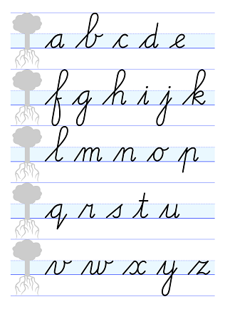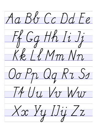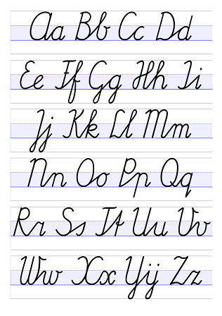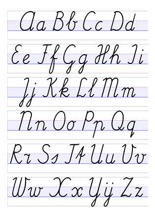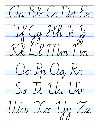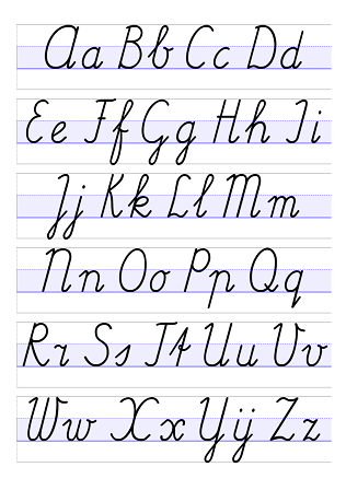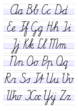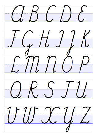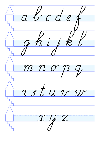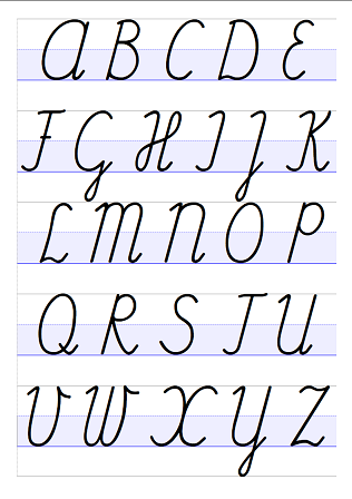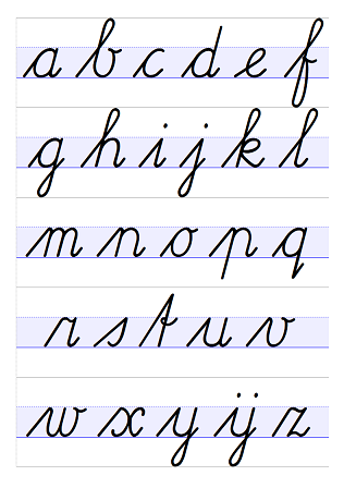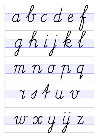 Op deze pagina zijn letterkaarten te downloaden met schrijfletters in verbonden schrift (“schuinschrift”, “lusletters”).