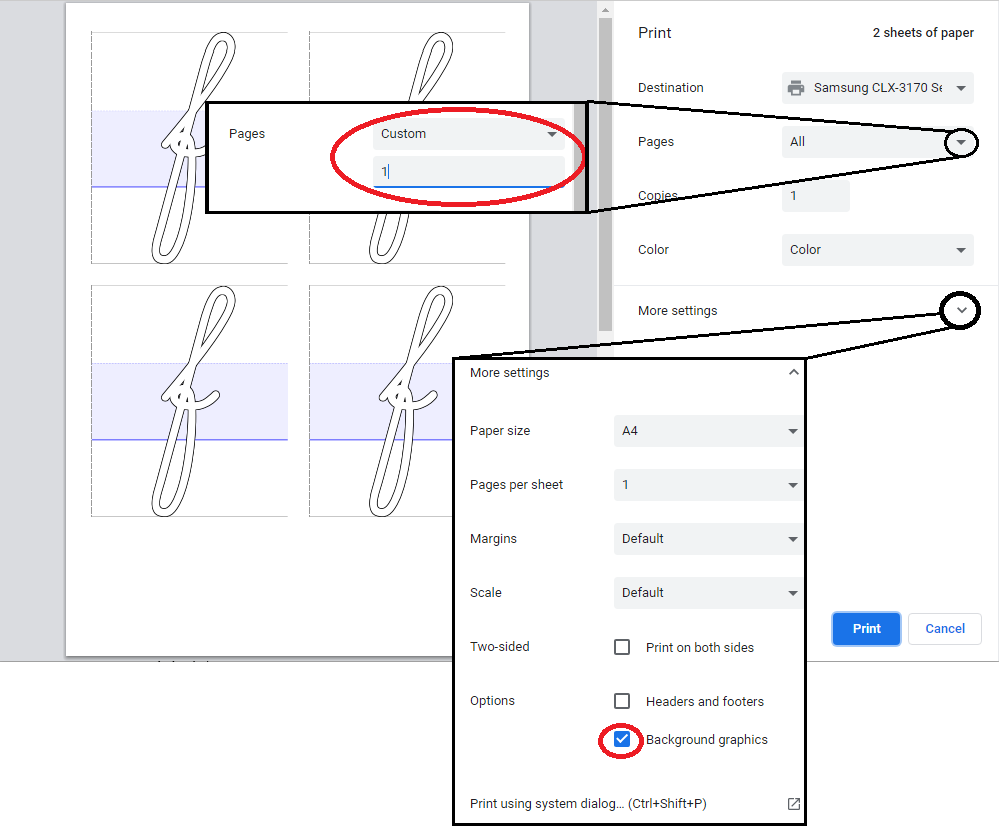 De print-dialoog kan geopend worden met Ctrl-P. In deze dialoog verschijnt een preview waarin je direct kunt zien wat het resultaat van je aanpassingen is. De instellingen die aangepast moeten worden, zitten beide verborgen achter uitklapmenu's. Je klikt dus eerst op het uitklappijltje (zwart omcirkeld) en daarna pas je de instelling aan (rood omcirkeld).