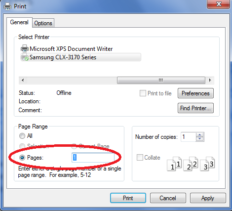 Na afsluiten van het 'Page setup' dialoog moet vervolgens de Print-dialoog geopend worden, bijvoorbeeld met Ctrl+P. In de Print-dialoog moet ingesteld worden dat alleen pagina 1 uitgeprint wordt.