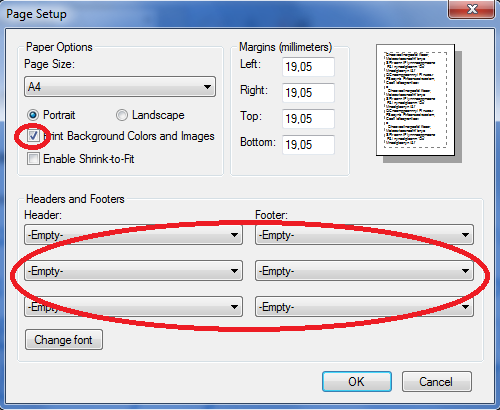 In dit menu moeten de achtergrond-aanbeeldingen aangezet worden. Desgewenst kunnen ook de headers en footers leeggemaakt worden.