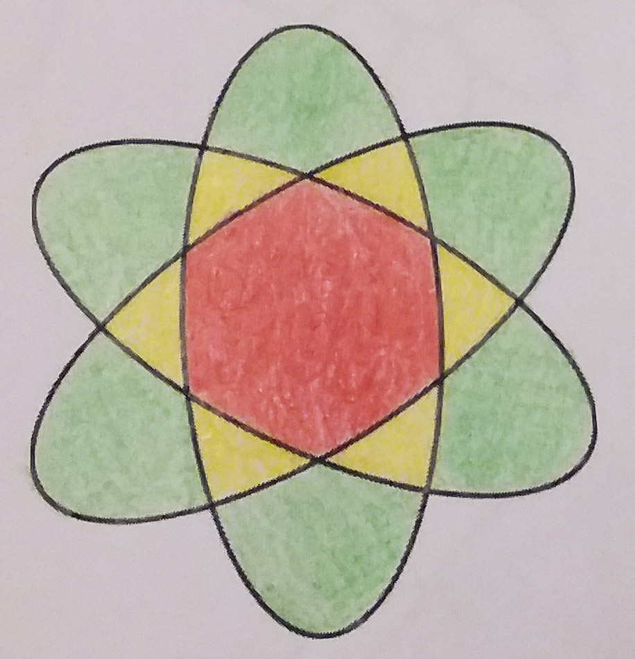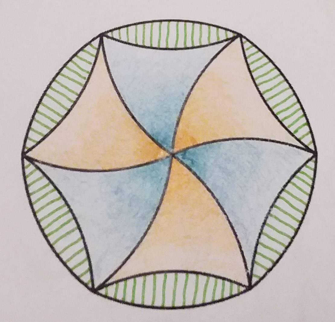 Bij het arceren moet deze tekening voortdurend gedraaid worden. De driehoeken zijn gekleurd met kleurverloop: donker aan de centrumkant, licht aan de buitenkant.
