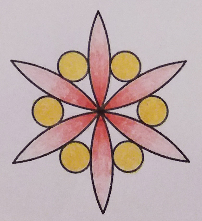 - Tenslotte kunnen we leerlingen vragen om binnen één vlak een geleidelijk kleurverloop van donker naar licht aan te brengen. Bijvoorbeeld scherpe hoeken het donkerst en stompe hoeken het lichtst (waarbij we natuurlijk een voorbeeld laten zien!). Bij een bloem- of wielfiguur kunnen we de centrumkant van elk vlak het donkerst maken en de “buitenkant” het lichtst.