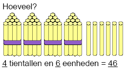Tja, de werkbladen spreken hopelijk voor zich. De opdracht is steeds om de afgebeelde staafjes/eieren/bolletjes te tellen. Deze staafjes/eieren/bolletjes zijn in groepen van 10 gegroepeerd, zodat er handig m.b.v. tientallen geteld kan worden.